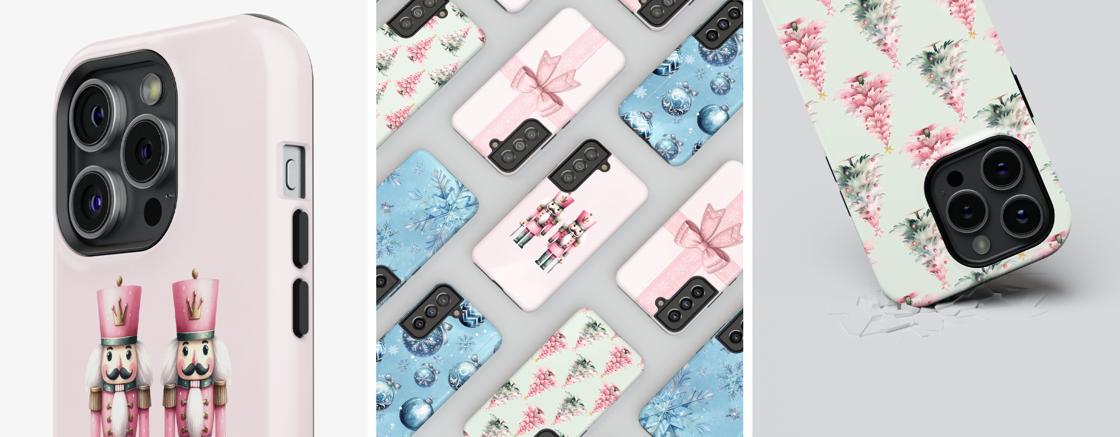 Choose your model to shop iPhone and Samsung tough cases, then complete the story with matching accessories for iPad, MacBook and earbuds. Because artwork is placed per device, pattern placement varies slightly; that small variation gives each piece a unique finish while your bundle stays perfectly coordinated. For gifting, pair this Nutcracker iPhone case with the matching earbuds case, or mix it with our Snowdrop Baubles and Peppermint Pines designs to create a pastel holiday theme across all your tech.